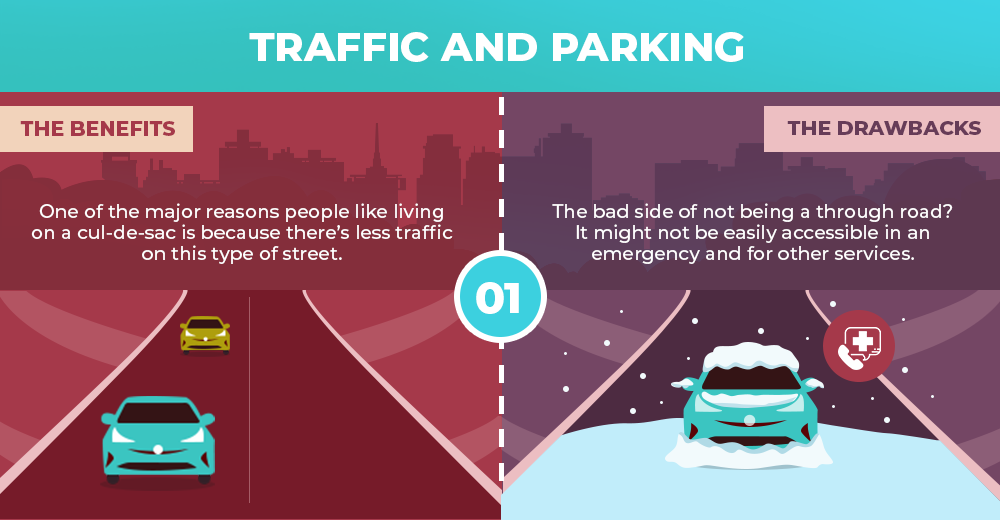 The drawbacks: The bad side of not being a through road? It might not be easily accessible in an emergency and for other services. When it snows, main roads and heavily trafficked blocks get plowed first and quickly. Cul-de-sacs, on the other hand, are usually the last to have snow removal services. Homeowners might also have trouble getting other municipal services like garbage pickup, because the vehicles may have difficulty accessing and turning around the road, causing traffic congestion. Forgotten and disregarded service can be an issue since streets like these are small.